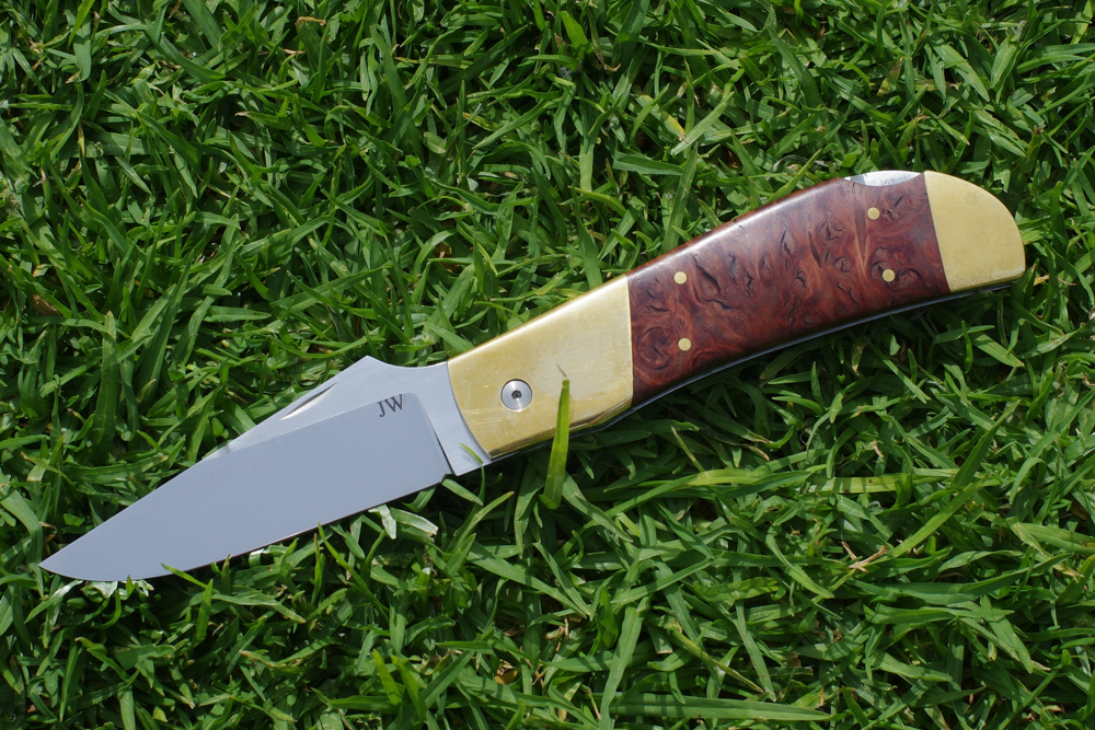 IZZY8648 February 4, 2019 1000 × 667 Knives 2018 Leon Folder. CPM154 blade, mirror polished, dovetailed brass bolsters, jarrah burl handle. Sold Like Loading...