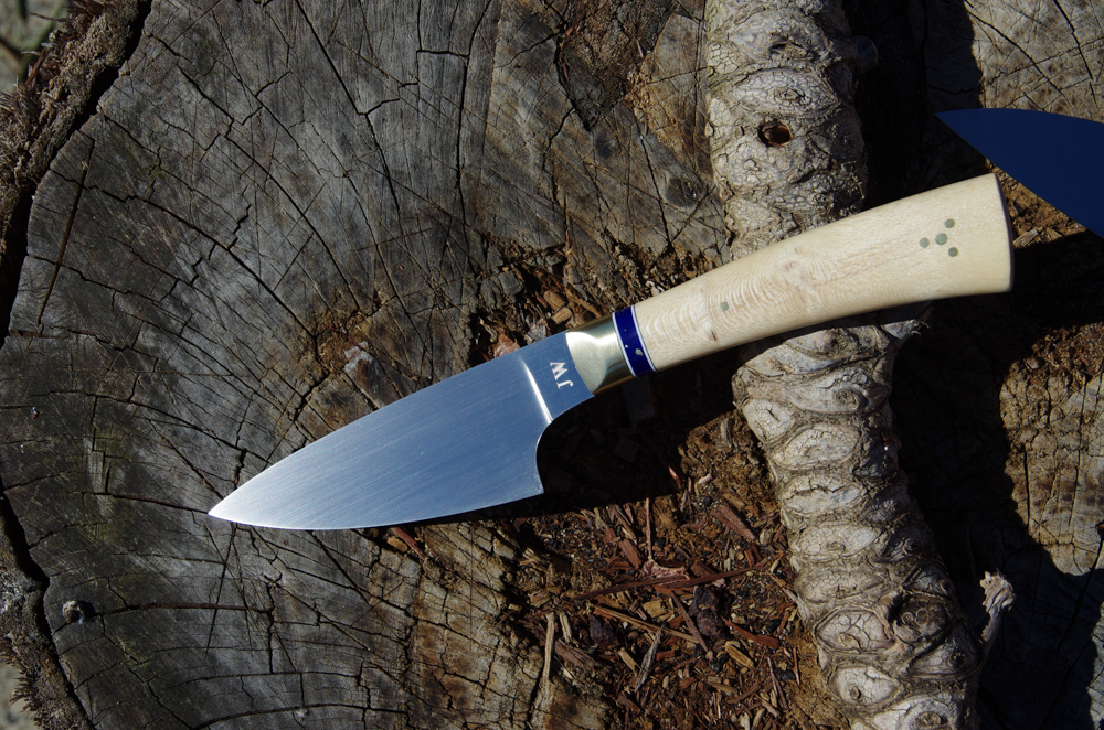 JEZA7995 February 4, 2019 1000 × 662 Knives 2018 Half Chef. CPM154, matte finish, brass bolsters, stabilized silky oak handle. Sold Like Loading...